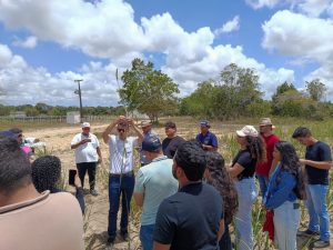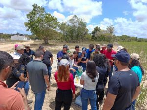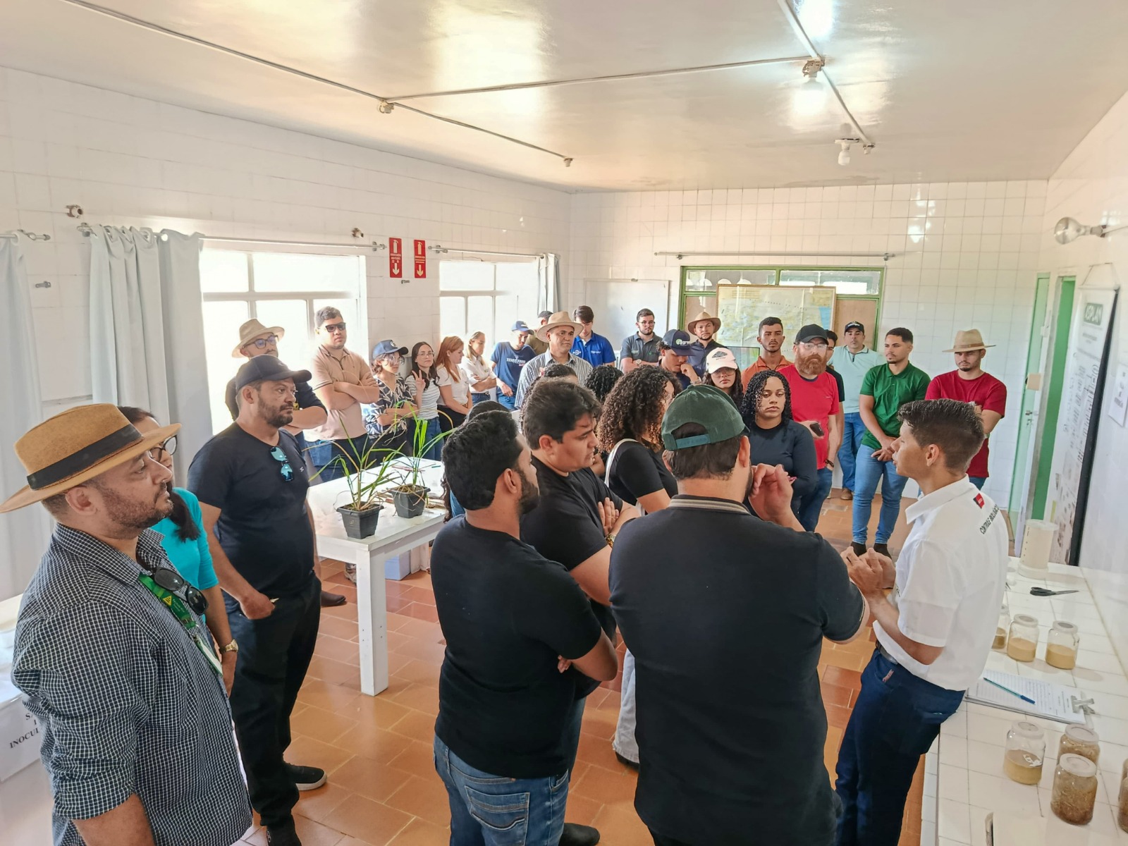 Estudantes da Facene durante visita à estação de CamaratubaHouve também demonstrações no campoO grupo também vivenciou experiências no campoRoberto Balbino, biólogo da Estação, consuziu os trabalhosGrupo da Facene conheceu produção de insumos biológicos da Estação no sábadoNo campo, o grupo da Facene acompanhou como age os bioinsumosO grupo de estudantes e professores da Facene que visitou a Estação no último sábado (8)