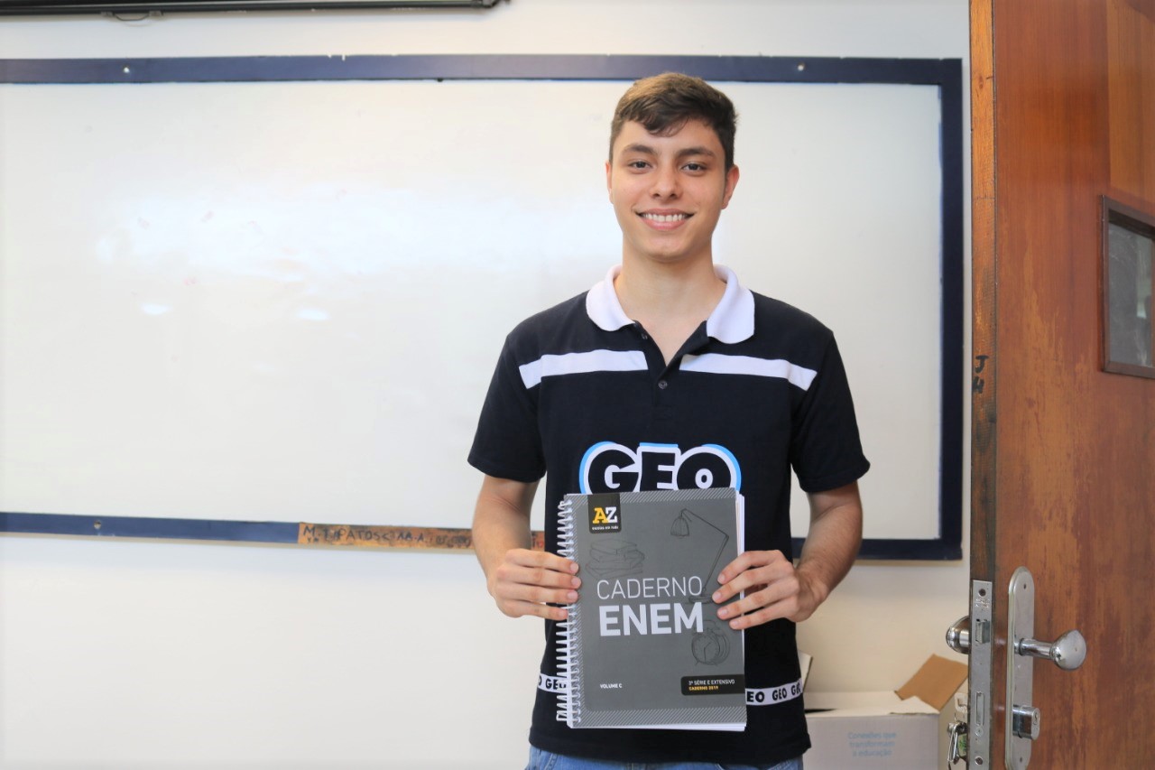 Um dos alunos do terceiro ano já com seu Caderno