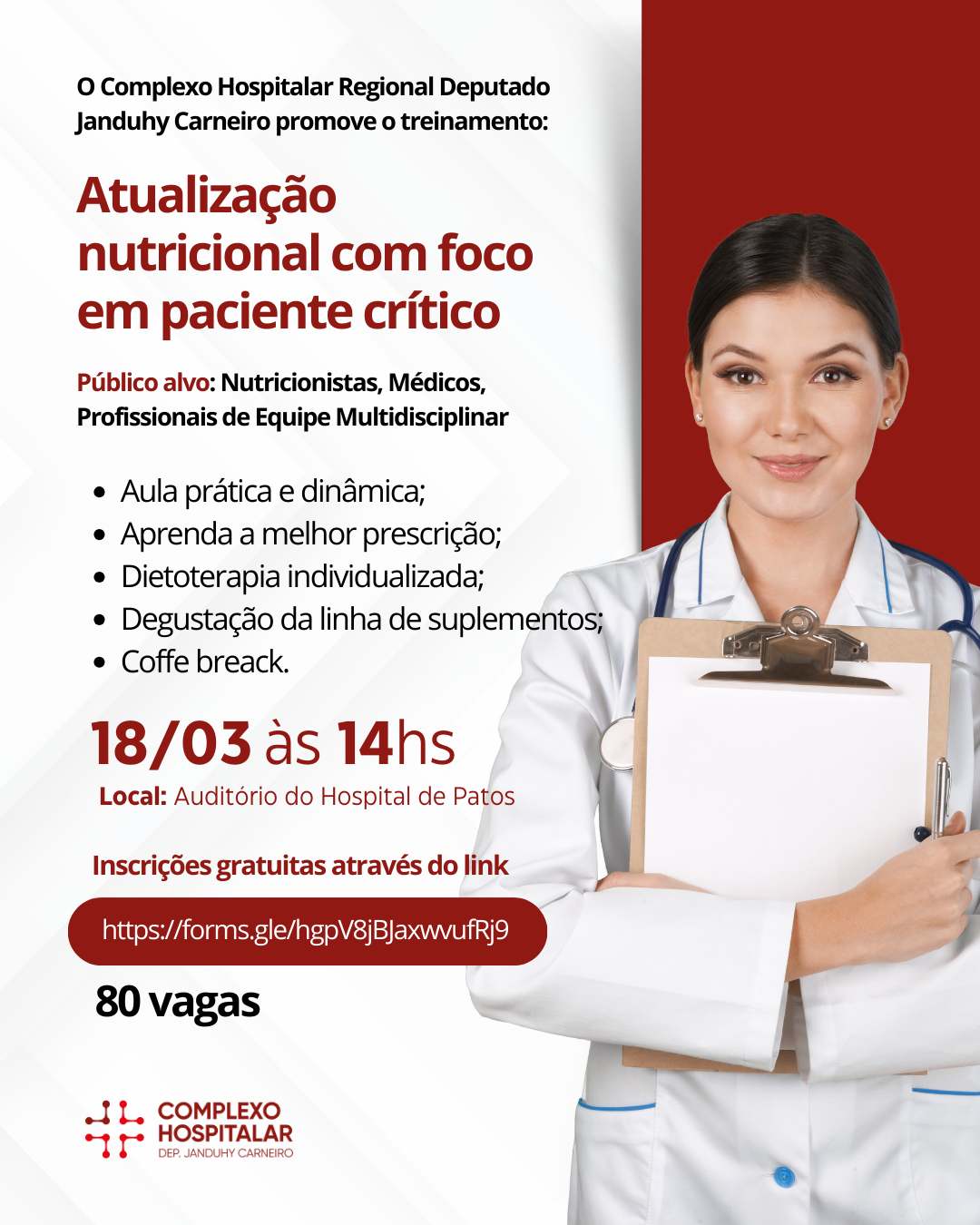 As evidências científicas demonstram que uma nutrição adequada otimiza a resposta clínica do paciente crítico, minimizando complicações relacionadas ao estado nutricional e contribuindo para uma melhor evolução. E buscando aprimorar o serviço nutricional com foco neste paciente, o Complexo Hospitalar Regional Deputado Janduhy Carneiro (CHRDJC) promoverá uma capacitação voltada para nutricionistas, médicos, enfermeiros e profissionais da área. O curso ‘Atualização nutricional com foco em paciente critico’ acontecerá, presencialmente, no dia 18 de Março, no auditório do hospital, das 14h às 18h, em Patos.As inscrições são gratuitas e podem ser realizadas através do link https://forms.gle/hgpV8jBJaxwvufRj9.