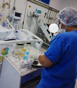 A implantação de medicação beira leito, com dupla checagem, que tem proporcionado um cuidado de forma integral e individualizada aos pacientes internados em UTI, foi uma das ações implementadas em Patos a partir do Projeto da SES. “Nesta situação, a equipe de enfermagem permanece o maior período de tempo ao lado do paciente, além do benefício de aumentar o vínculo paciente e equipe assistencial, observamos que o procedimento se torna mais seguro, como por exemplo, o processo de administração de medicamentos, pois todos os momentos são realizados na frente do paciente”, explica Josineide. O registro no prontuário do paciente que é realizado imediatamente após a assistência, minimizando a possibilidade de eventos adversos relacionados a identificação dele, também foi outra ação implementada com o Projeto, em Patos.