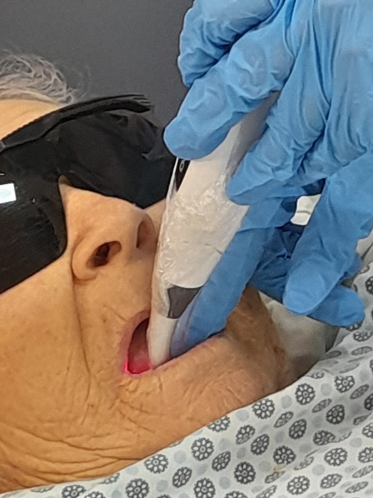 Sobre laserterapia – Ela é uma modalidade terapêutica consagrada na literatura para o tratamento da mucosite, inflamação da mucosa bucal, que é comum em pacientes submetidos à quimioterapia ou radioterapia e apresenta excelentes resultados na prevenção e controle de diversas condições, além de possibilitar ao paciente uma alimentação adequada, que é fundamental para a continuidade do tratamento. É um tratamento de aplicação simples, segura, que reduz a inflamação local, alivia a dor e traz mais conforto para o paciente. É indicada em pacientes oncológicos quando há mucositose oral, xerostomia, disgeusia, edema, cárie por radiação, radiodermite, hemorragia, osteorradionecrose, trismo, entre outras intercorrências na boca.