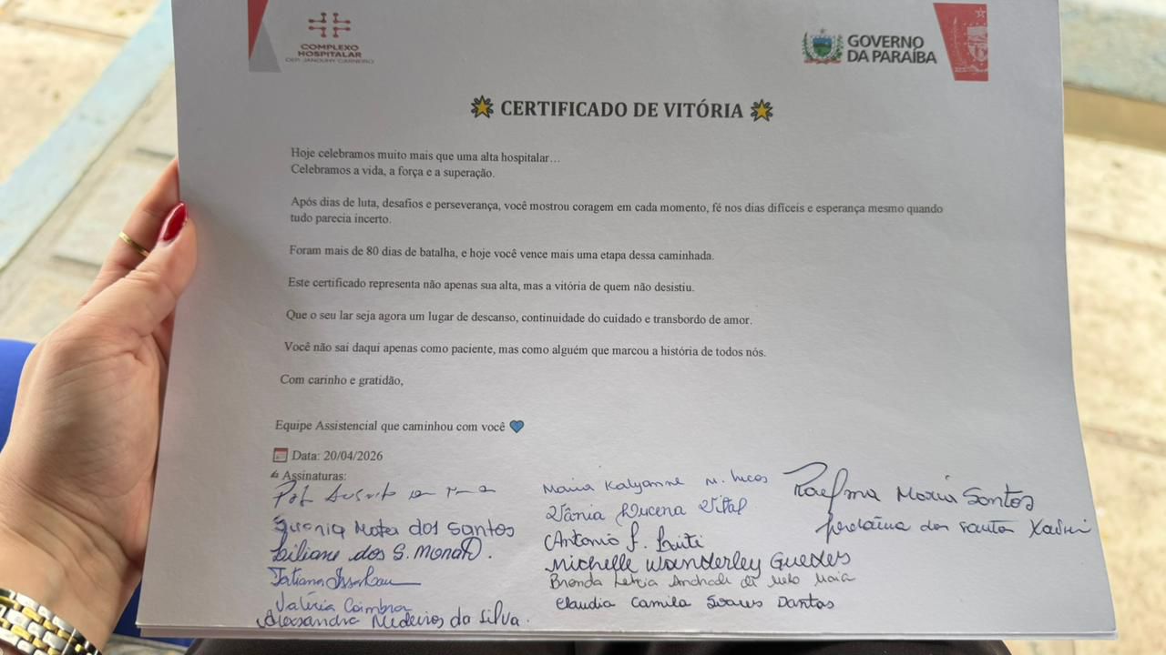 O Hospital Deputado Jandhuy Carneiro – unidade integrante da rede estadual de saúde – em Patos, realizou na última segunda-feira (20) a desospitalização do segundo paciente da unidade com garantia de acompanhamento integral pelo Programa de Internação Domiciliar (Home Care PB). A paciente Maria Suely de Oliveira Moreira, de 62 anos, deixou a Unidade de Terapia Intensiva (UTI) após 80 dias de internação e seguirá o tratamento em casa, com o apoio da família e assistência profissional 24 horas. Na ocasião, recebeu um certificado simbólico de “Vitória”.